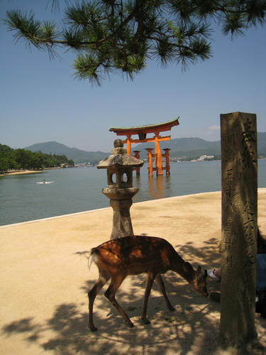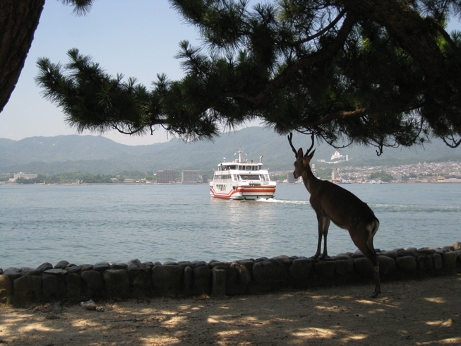 フェリーと鹿。奥に見えるのが本州です。
