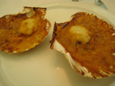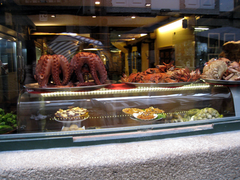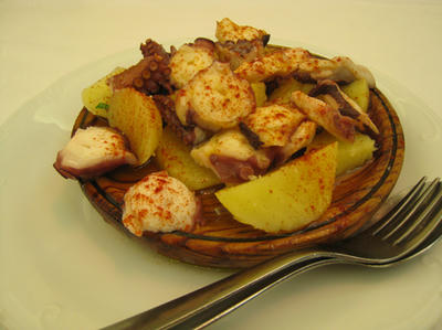 街に到着。お参りの前に昼食。タコとジャガイモのガリシア風とホタテグラタン。