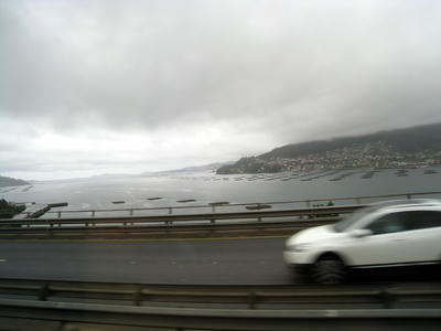ビスケ湾。リアス式海岸で海に浮かぶ黒板は、牡蠣を養殖しているそうです。