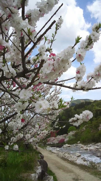 ここは白っぽいですが、川沿いに何キロも咲き誇っている紅・白・桃とまばらな花の色と背景の新緑が混じって大変不思議な光景でした。