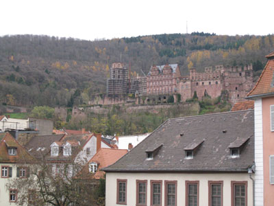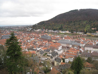 奥の赤茶の大きな建物がハイデルベルク城。