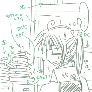 場所が空いているとついつい雑誌や専門書や漫画や小説などを置いてしまいます。私の定位置(作業PC机)に最も近いのに空間があるせいだね;スキャナ使うのに上のものをすべてどかさないといけないので、めんどーです。でも、一番ほしいものが積み上げてあるので便利なのが悩みどころです。