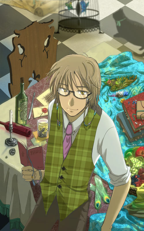果物、ワインの瓶(の反射)、宝石、アンモナイトの化石、古書、孔雀の羽根、猫、蝶、鳥籠、眼鏡…etc