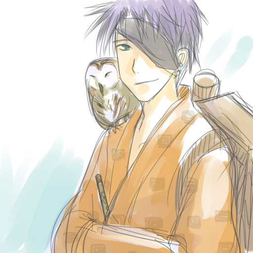「双 たいらは人間の絵師で、不敵な笑みのドS。 緑色の隻眼で、紫系短髪真ん中分。柿色の雷紋柄の浴衣を着、竹の笛を持ち歩く。梟を連れ、竜宮城によく現れる」