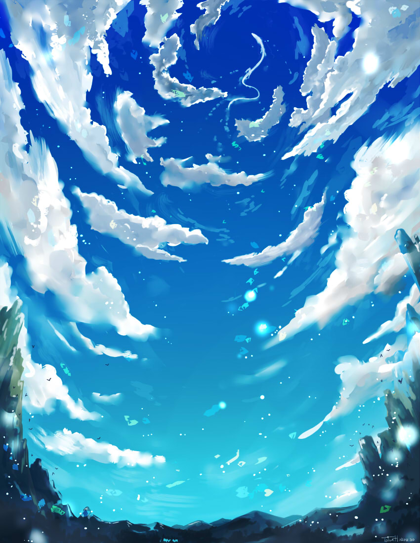 似た構図ですが、ありえない雲の流れとか、風が感じられる雰囲気のが大好きなので、ついつい描いてしまいます。
